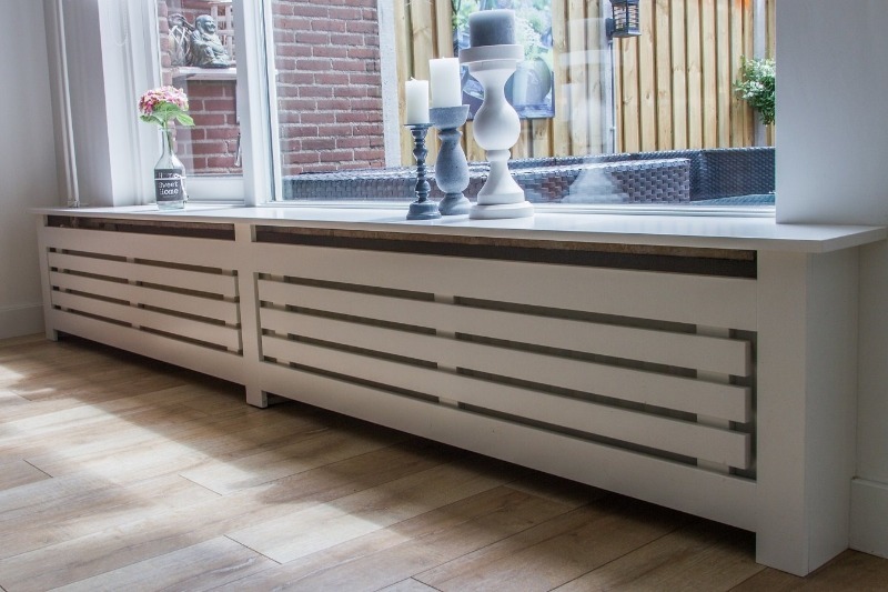 En utilisant une table ou une armoire sans paroi arrière, il est très facile de cacher le radiateur. Sur une table de chevet ou une table, vous pouvez mettre une plante thermophile, un beau vase. Il est important de retirer la paroi arrière pour que la chaleur se propage dans toute la pièce.