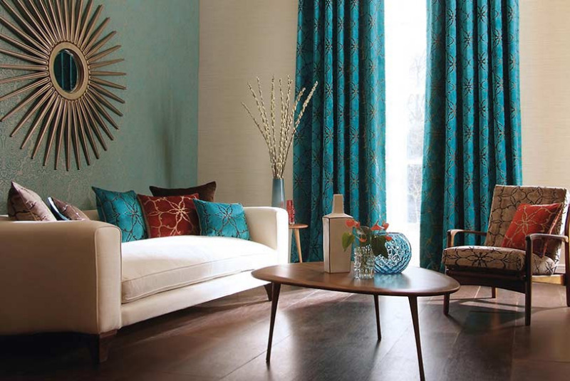 Cette couleur crée une atmosphère chaleureuse et confortable dans la maison. Pour des expériences vives avec la couleur riche sélectionnée, une cuisine ou une salle de bain convient. Une combinaison de murs blancs et de taches turquoises (plaid, rideaux, oreillers) sera élégante dans la chambre. Un intérieur riche et sobre se révélera avec la participation de la turquoise avec de l'or et de l'argent. Un décor noir minimal se penchera élégamment dans l'intérieur turquoise.