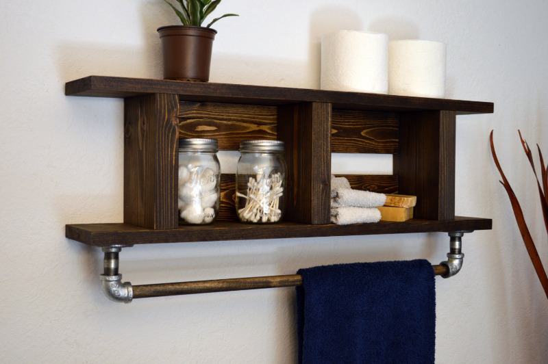 Vous pouvez diversifier l'intérieur de la salle de bain avec une étagère. De plus, il ajoutera un espace de rangement utile, ce qui est utile pour une petite salle de bain.