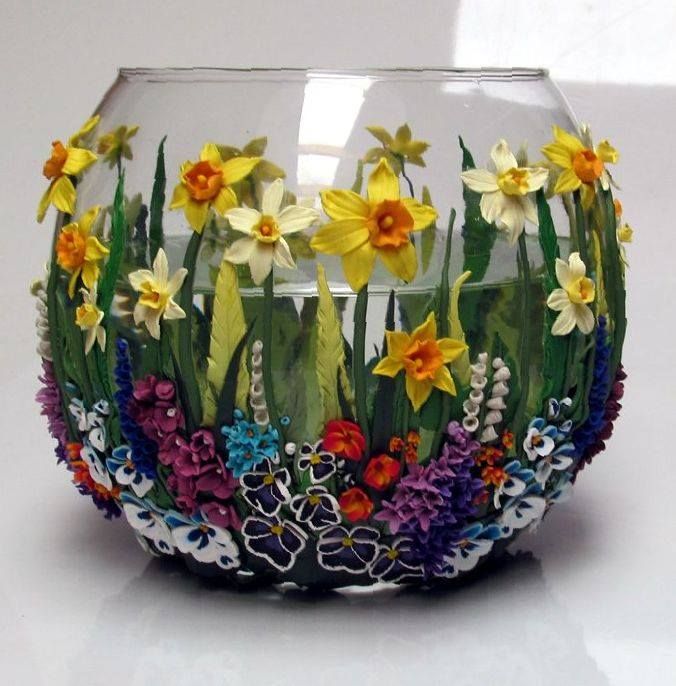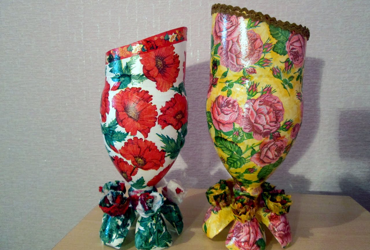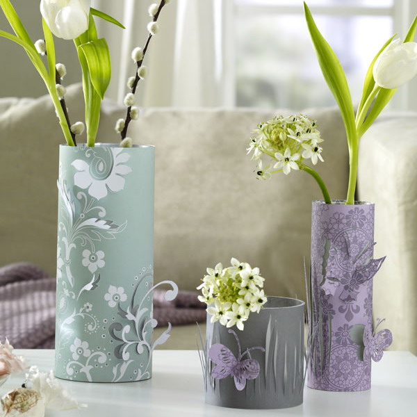 Les fleurs coupées peuvent être mises dans n'importe quel récipient étanche. Par conséquent, le maître de maison doit décider quelle option arrêter: décorer le vase ou le verre acheté, qui a l'air un peu ennuyeux, avec du papier coloré, du tissu, des peintures, ou peut-être créer votre propre œuvre unique à partir des matériaux disponibles.