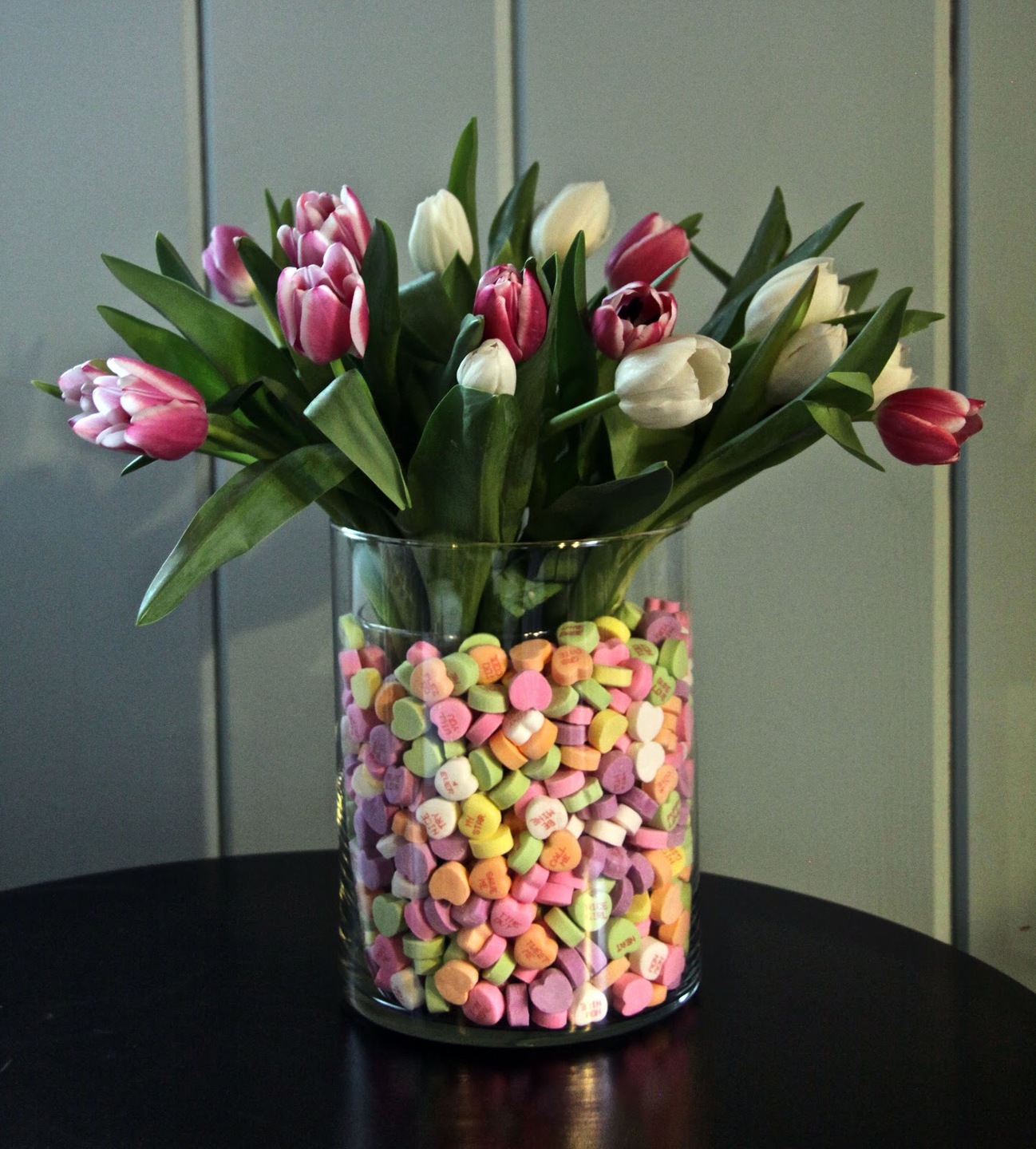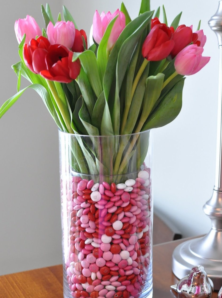 Si vous installez un petit vase de fleurs dans un récipient spacieux et remplissez l'espace libre entre les parois des récipients avec des éléments lumineux, vous obtenez une décoration simple mais inhabituelle pour un événement festif. En tant que charge, dont la couleur doit être combinée avec les nuances du bouquet, utilisez des bouchons de vin, des bonbons colorés ou même des légumes crus.