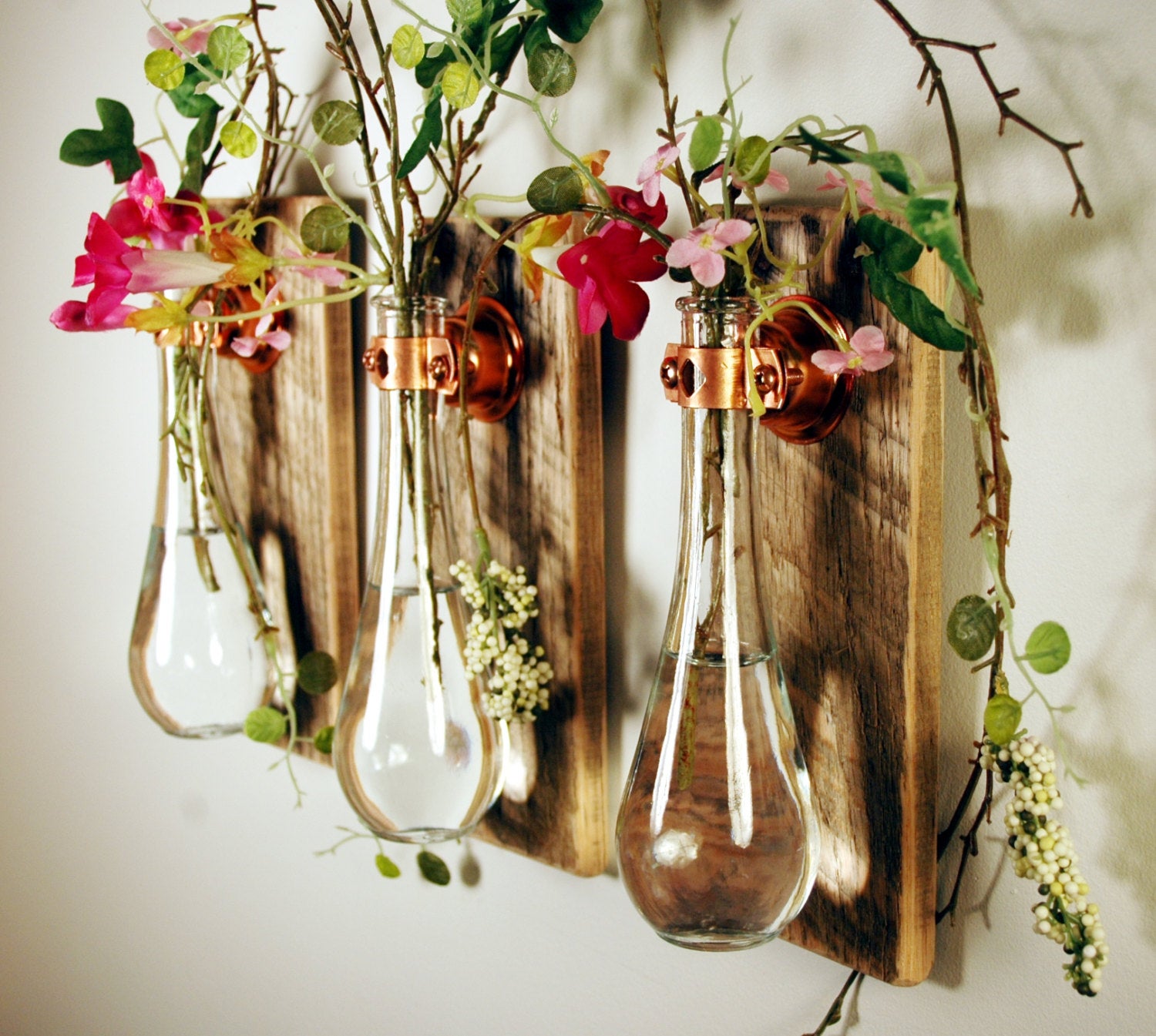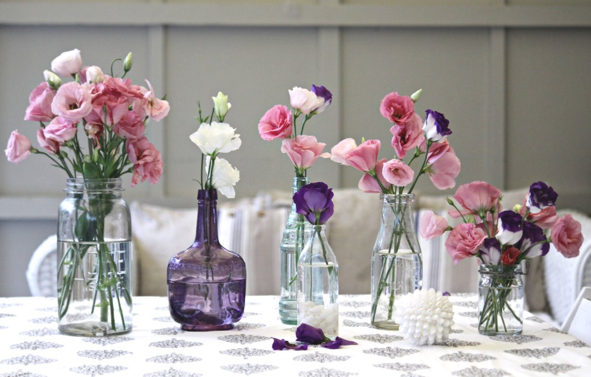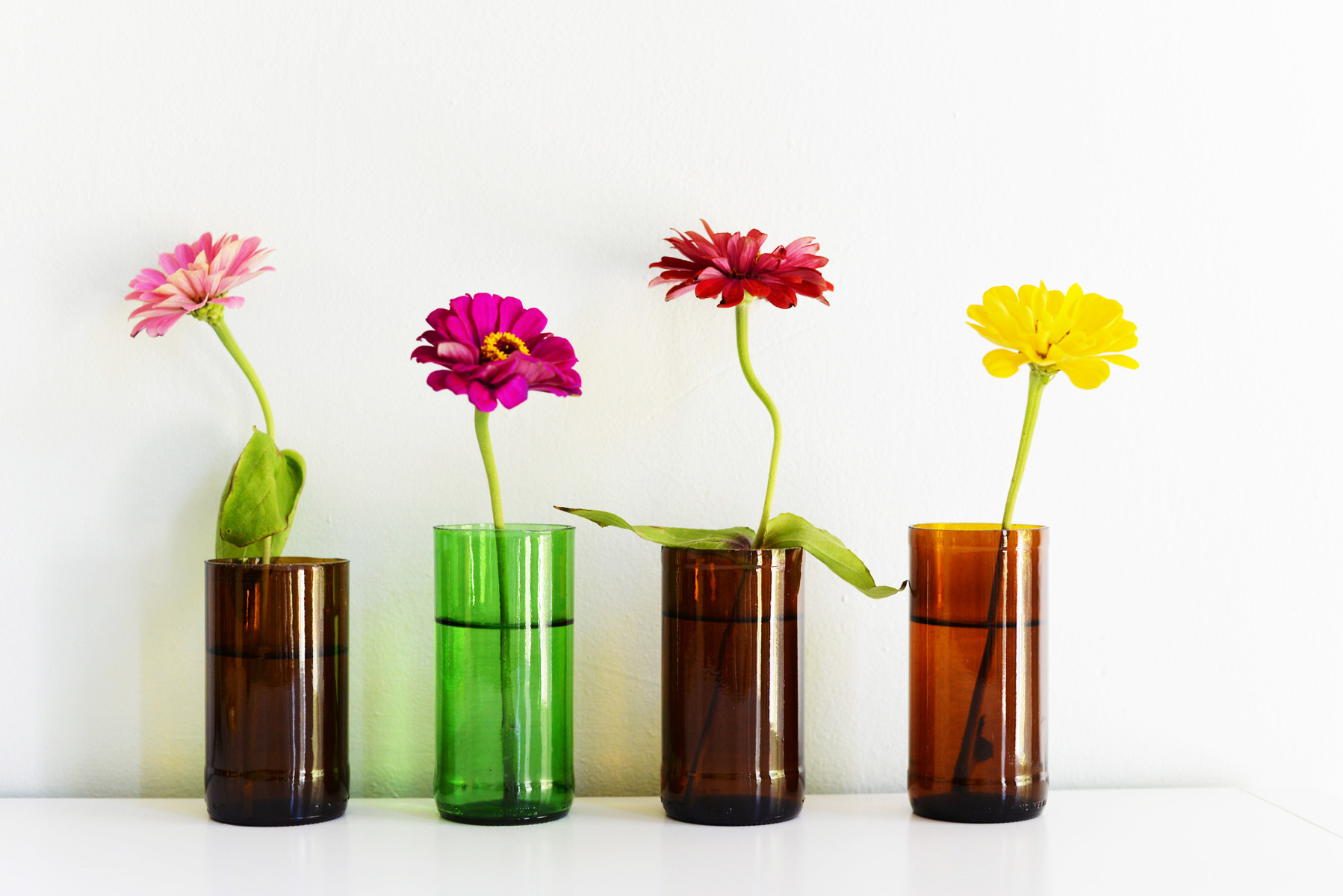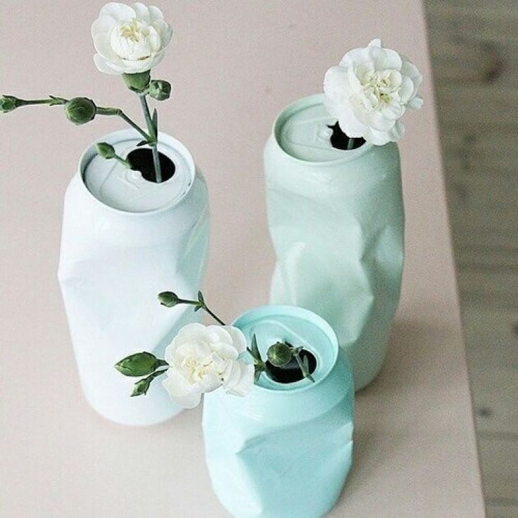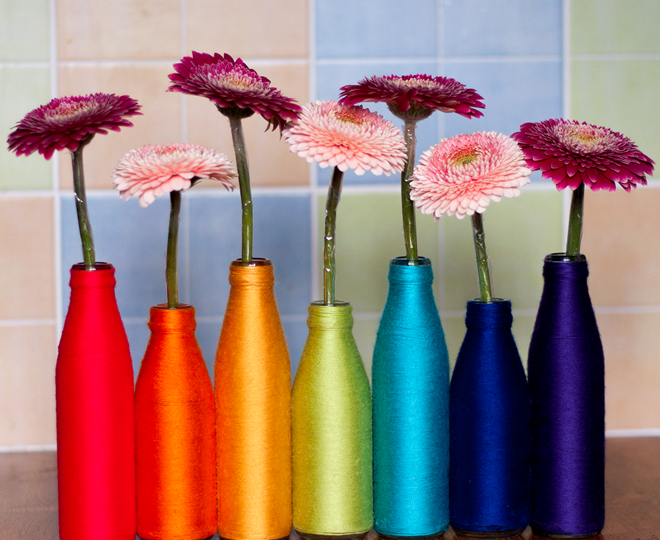 Les bouteilles vides ou les canettes de verre coloré se marient bien avec les fleurs fraîches et les bouquets.
