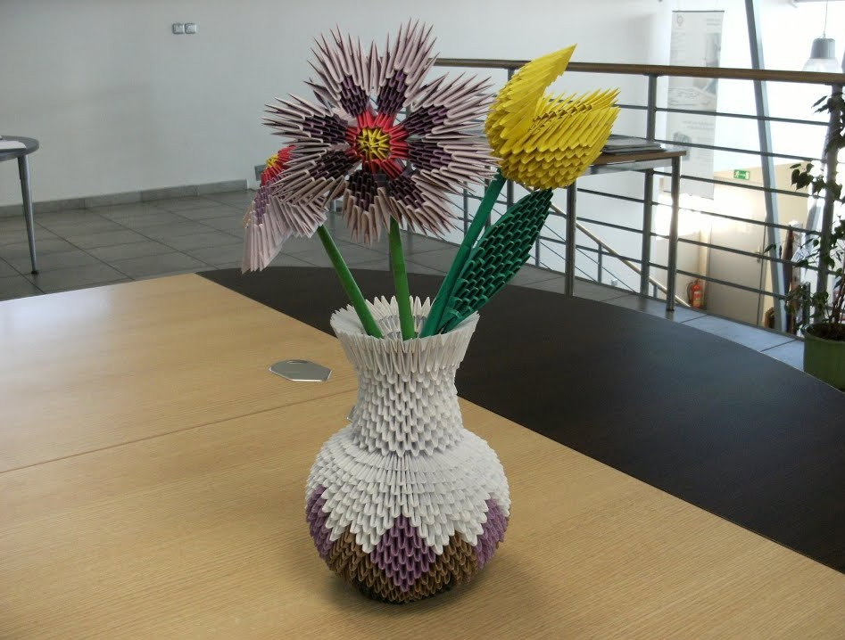 Le vase en papier d'origine et les «fleurs» colorées peuvent être fabriqués en utilisant la même technique d'origami modulaire.