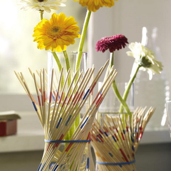 Les vases décorés de bâtons en bois seront originaux dans une cuisine moderne. Et les détails du designer pour enfants s'adapteront aux articles sur le bureau.