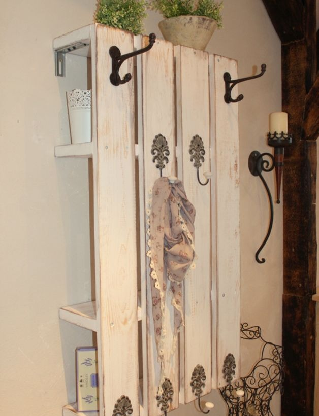Les caractéristiques de conception des palettes vous permettent de créer à partir d'eux des appareils de toute complexité: avec des étagères et des niches pour chaussures. Il est possible en peu de temps et sans trop d'efforts de rendre le hall d'entrée plus pratique.