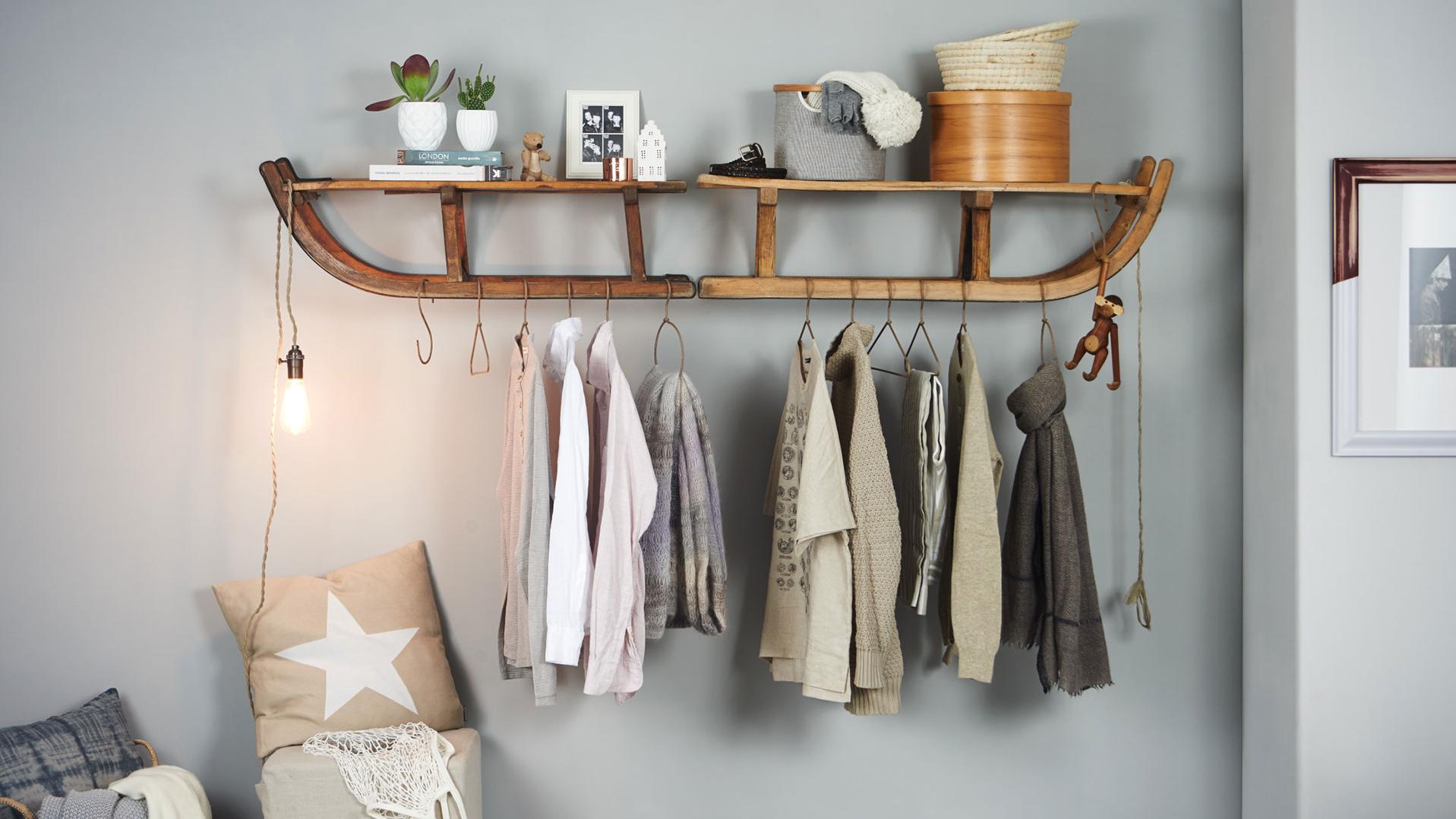 Une option inhabituelle est un cintre en blocs de bois et en tissu. Il ne prend pas beaucoup de place et peut être facilement réorganisé si vous le souhaitez.