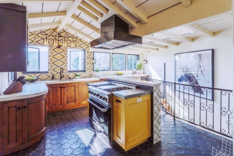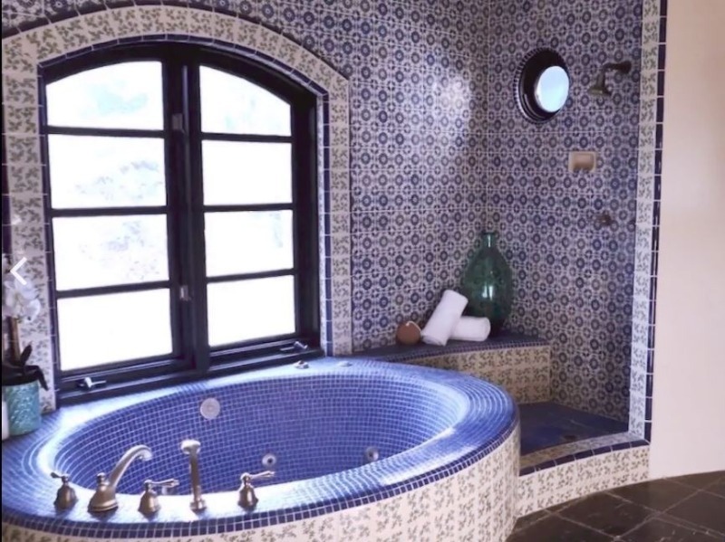La salle de bain est peut-être la plus intéressante de toutes les pièces de la maison sur les collines d'Hollywood. Elle est décorée dans un style oriental - une baignoire en mosaïque, un mur en carreaux avec de petits ornements.