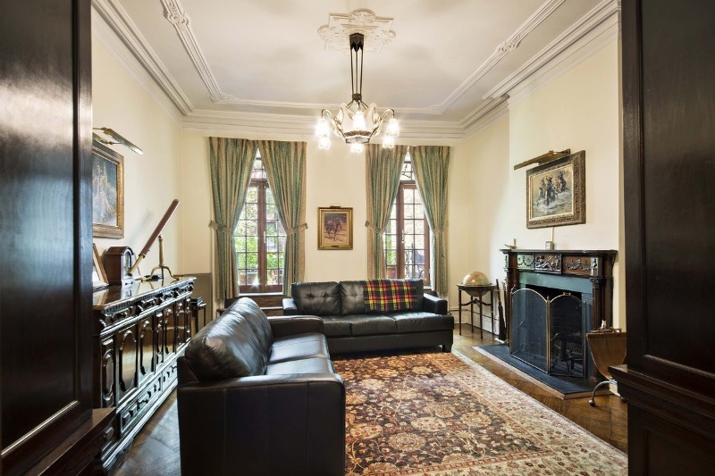 Salon classique avec cheminée - vous pouvez facilement imaginer Marilyn sur l'un des canapés en cuir. Le salon est un peu démodé - meubles sculptés, peintures, télescope sur une commode et globe. Rappelle un ancien domaine anglais.