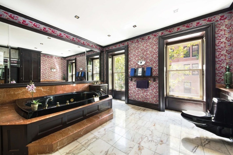L'énorme salle de bain est finie en chocolat et couleurs sombres combinées avec des accents de framboise. Tout le mur au-dessus de la salle de bain est occupé par un miroir. Cela agrandit visuellement l'espace. Cet effet peut être obtenu en utilisant un grand miroir vertical ou horizontal sur un mur libre.