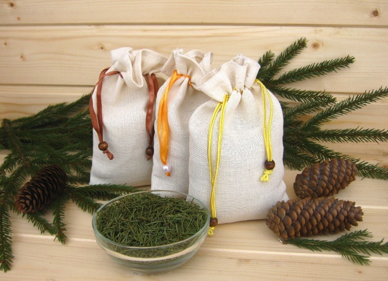 En plus des avantages pour la santé, les aiguilles peuvent devenir un arôme naturel pour la maison et les textiles. Pour ce faire, il suffit de coudre un sachet rempli de beauté verte. Vous pouvez même les utiliser comme une petite présentation à des parents et amis, en plus de décorer le sac. Il sent non seulement agréable et naturel, mais désinfecte également l'air et le linge et élimine également l'insomnie.