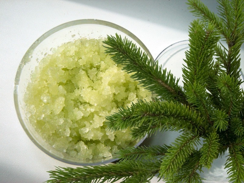 Les aiguilles contribuent également au soin de la peau, des cheveux et des ongles. Il possède des propriétés anti-cellulite, raffermissantes et antifongiques. Si vous devez vous débarrasser de la "peau d'orange" sur les hanches et les fesses, préparez un gommage aux conifères. Pour un morceau d'aiguilles de conifères séchées, prenez: