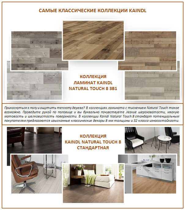 Avez-vous remarqué comment exactement les échantillons de contrôle du stratifié sont présentés dans le supermarché du bâtiment? Bien sûr, en tant que produit naturel, c'est-à-dire vous voyez devant vous plusieurs planchers sélectionnés réunis. Ils sont faciles à voir, à étudier la texture et à toucher les futures lames de parquet. Et Kaindl gagne cela, ce qui est probablement le plus grand mouvement marketing. Mais à la fin, à l'intérieur, ces sols ont l'air originaux, et il est difficile de les distinguer des vrais en bois.