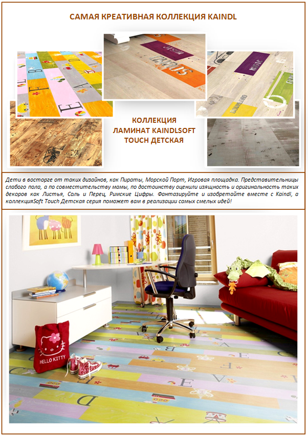 Mais les concepteurs de la fabrication de la collection pour enfants n'ont pas du tout essayé de faire ressembler le stratifié à du parquet. Ici déjà, l'objectif était de créer un intérieur vraiment unique à l'aide de décors de fantaisie, d'imprimés lumineux et de jolies inscriptions.