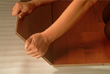 Ensuite, vous devez poser l'étanchéité. En tant qu'option la moins chère, mais pas la meilleure, soyons honnêtes, un film ordinaire convient, se chevauche et est connecté avec du ruban adhésif.Il est préférable d'utiliser des substrats spéciaux en mousse de polystyrène extrudé ou en mousse de polyéthylène, qui ont également des propriétés d'absorption acoustique. Substrat bitume-cellulose encore plus efficace, respectivement plus cher, qui comprend des copeaux de liège. Lors du choix de cette option, il convient de rappeler qu'elle n'est pas compatible avec les sols chauds et nécessite des plinthes spéciales «respirantes». Les substrats en polymère pratiques, qui ont une base auto-adhésive, il est assez simple de les poser. Vous pouvez vous passer d'un substrat uniquement dans le cas de la pose d'un stratifié à quatre couches, car sa couche inférieure remplit les mêmes fonctions, mais dans ce cas, il est préférable de ne pas enregistrer, mais de poser un matériau d'étanchéité.