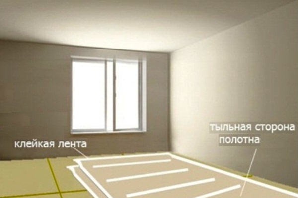 - Le ruban destiné à la fixation des matériaux de finition est posé autour du périmètre, près de la porte et à l'emplacement des joints aboutés, sans enlever la couche supérieure. Afin d'éviter le gonflement du matériau dans les parties centrales de la toile, des segments du matériau de ruban adhésif sont appliqués arbitrairement sur toute la surface de la pièce.