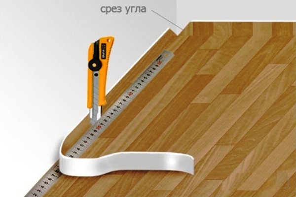 Avec les allocations remplies à l'approche du mur, le linoléum devrait s'allonger. Ensuite, les bords en butée contre les murs sont coupés. Avant de couper les bords des bandes de linoléum près des murs, les coins sont incisés en diagonale. Terminez le travail en installant la plinthe.
