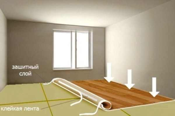Les attaches de ruban peuvent d'abord être appliquées sur le linoléum, puis rouler séquentiellement un rouleau avec des morceaux de ruban adhésif, fixer le revêtement au sous-plancher.