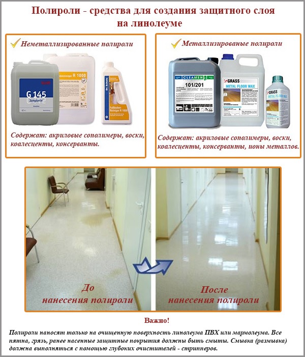 La composition traditionnelle des polis à polir le linoléum: dispersions aqueuses de copolymères acryliques, émulsions aqueuses de cires (naturelles ou synthétiques), coalescents, composants supplémentaires (pour lisser la surface, réduire le moussage) et conservateurs. D'autres substances peuvent être introduites dans la composition, par exemple le polyuréthane, ce qui rend le linoléum pratiquement «planchers en vrac». Le polyuréthane donne un brillant supplémentaire au revêtement, augmente (par rapport aux polis conventionnels) la résistance à l'usure. Cependant, les vernis au polyuréthane ont également un inconvénient - après la fin de la période de fonctionnement, ils sont très difficiles à laver du revêtement.