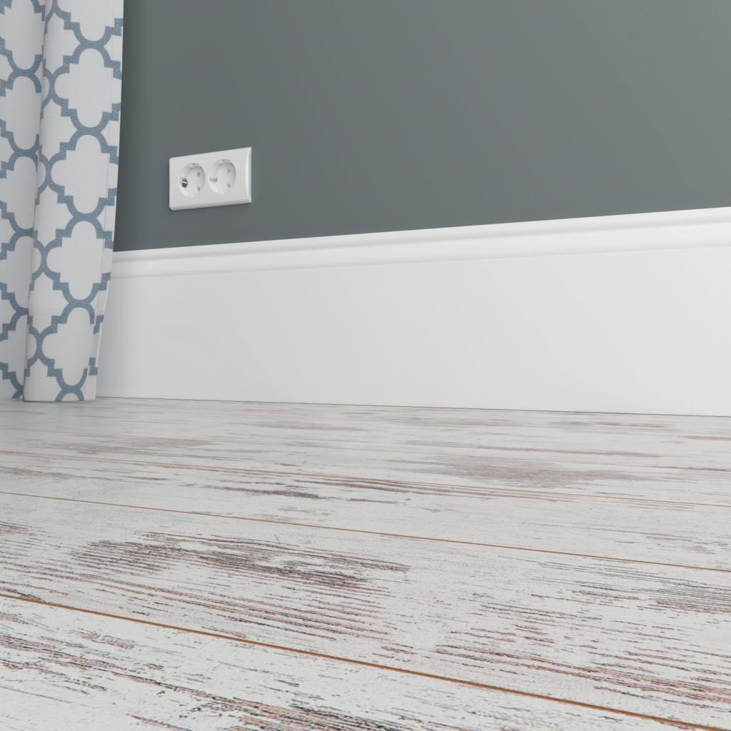 Les plinthes larges sont le meilleur choix pour les pièces avec n'importe quelle hauteur de plafond. Tout d'abord, cela est pratique car ils protègent mieux le bas du mur contre les dommages accidentels. Deuxièmement - esthétiquement et à la mode, et il y a une opinion que la tendance se développera sur une base croissante. Et si, selon votre plan, le mur doit être perçu visuellement comme une surface intégrale, un large socle peut être peint exactement dans sa couleur - de bons profils Ultrawood Ils sont fournis avec un apprêt d'usine, et toute peinture sur bois convient à la peinture, qui, bien sûr, peut être teintée.