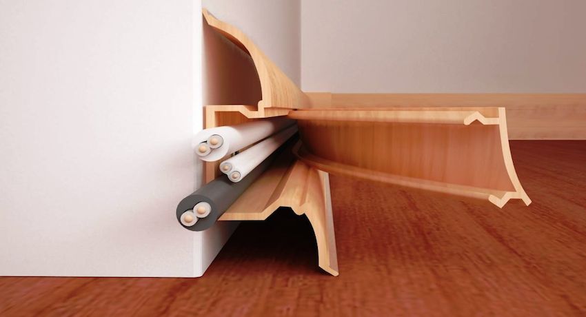 Les plinthes universelles ont une conception creuse et, à leur tour, sont divisées en produits avec des canaux de câble internes et externes. L'avantage des deux est la présence de rainures spéciales dans lesquelles une variété de câbles d'alimentation et de signal peut être posée. Les modèles avec cavités internes sont fixés au mur à l'aide de supports spéciaux, que les installateurs professionnels appellent des pinces.