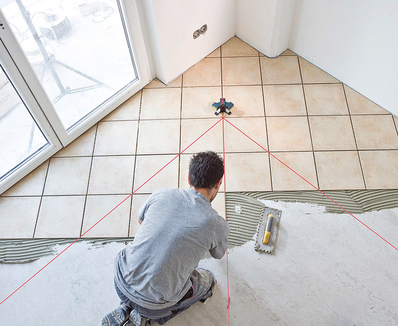 Vous devez d'abord marquer votre sol et voir si vous devez le mettre à niveau. La façon la plus simple de le faire est d'utiliser le niveau laser. Il suffit de l'installer dans l'un des coins de la pièce et de mesurer la distance des marques laser sur les murs au sol. Si cette distance est la même ou que l'écart ne dépasse pas 5 mm, vous pouvez vous passer de l'alignement préalable. Une telle courbure est assez simple à éliminer déjà en cours de pose de carreaux.