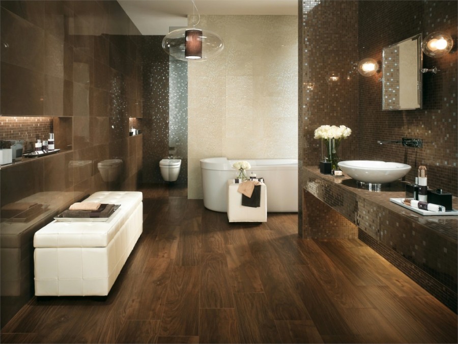Bien sûr, diverses fleurs et motifs sont une question de goût, cependant, même les dessins abstraits sous forme de lignes ne sont plus à la mode aujourd'hui. Si vous voulez obtenir un intérieur vraiment à la mode et élégant, concentrez-vous sur le décor, qui imite la pierre, le bois, le béton, le cuir et d'autres matériaux naturels. Dans ce cas, vous devez refuser de poser des carreaux de différentes couleurs selon un motif complexe sous forme de formes géométriques, de rayures, etc. Nous avons décidé d'imiter la texture naturelle, alors faites-le selon les règles. Et ils disent que vous ne pouvez connecter la finition avec différentes nuances qu'aux coins intérieurs. De plus, les matériaux de tons différents doivent être séparés les uns des autres. Vous pouvez le faire en avançant ou en reculant les plans sur lesquels les carreaux de différentes couleurs et textures seront appliqués.