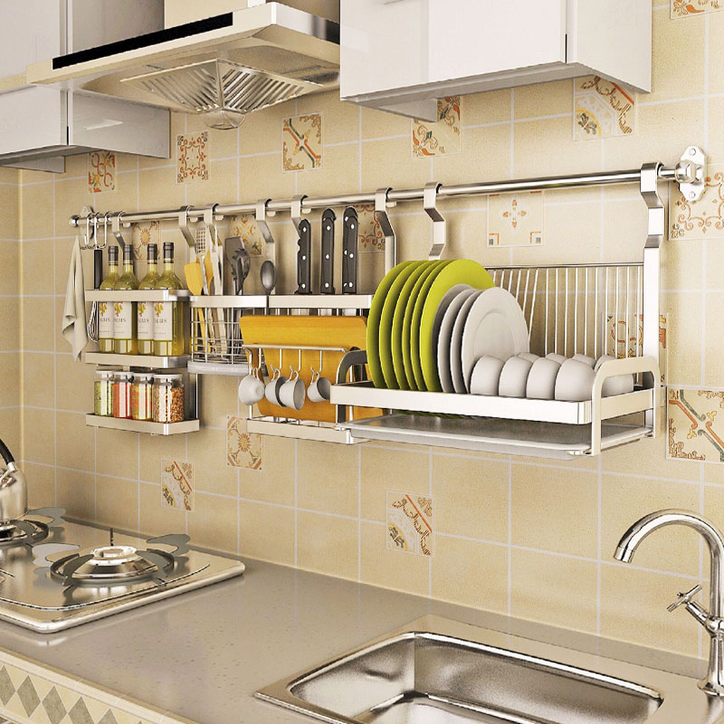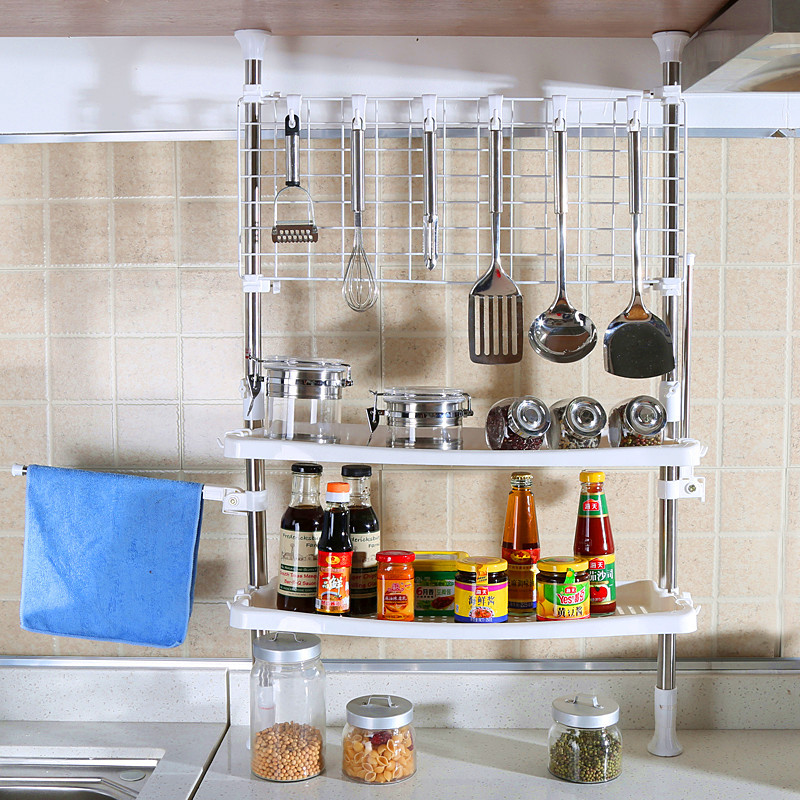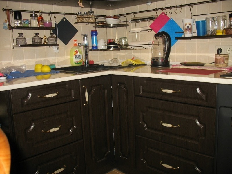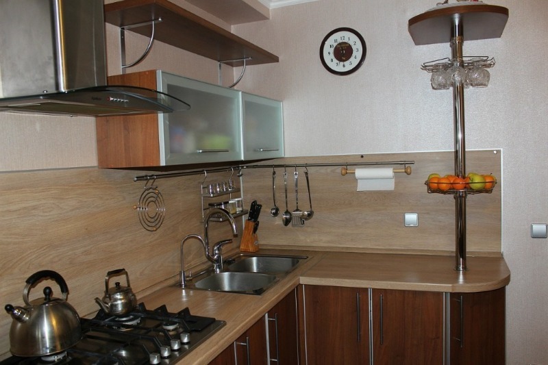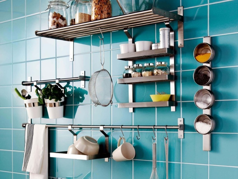 Une excellente façon de placer un grand nombre d'articles nécessaires à l'hôtesse est d'acheter des systèmes de garde-corps. Les tiges métalliques sont faciles à monter et à connecter, de sorte que les ustensiles ménagers, les serviettes, les punaises et les sous-verres sont à la disposition des cuisiniers. De plus, il y a une place pour un sèche-vaisselle, des conteneurs avec des assaisonnements et des stocks de produits de stockage à long terme.