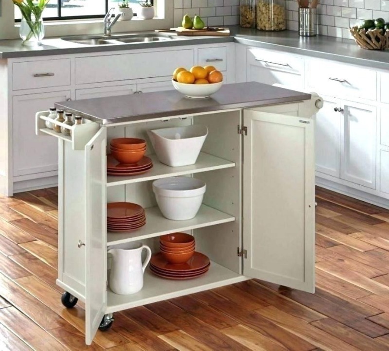 Si vous placez l'une des sections de la cuisine sur les roues, vous obtenez un placard, une surface de travail supplémentaire et un chariot pratique pour servir la table dans le salon.