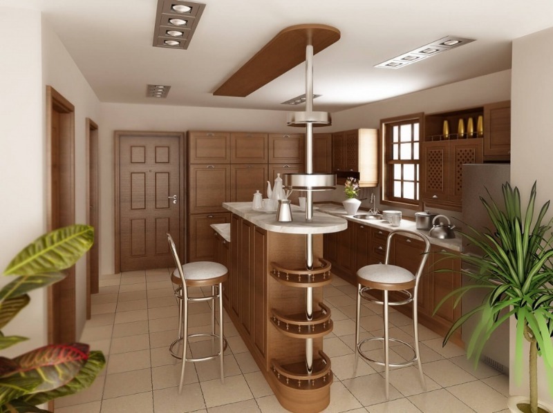 Une excellente option pour les petites cuisines est le bar, qui n'encombre pas l'espace et remplace avec succès une table à manger pleine grandeur. L'article deviendra encore plus fonctionnel s'il est équipé de garde-corps verticaux et de boîtes volumétriques.