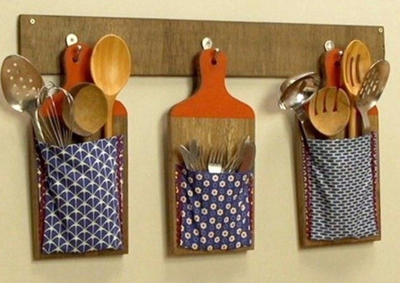 Les organisateurs faits maison pour les couverts, fabriqués à partir de matériaux improvisés, tels que des planches à découper et des poches en tissu, sont très compacts. Ils sont placés à la fois sur le tablier de cuisine et sur la surface intérieure des portes des meubles.