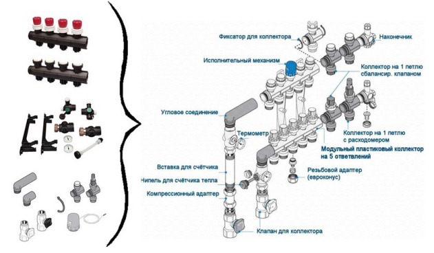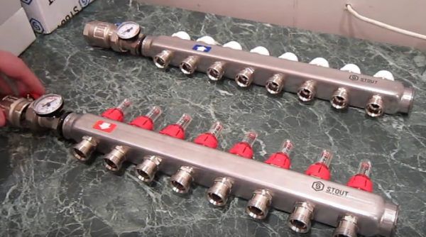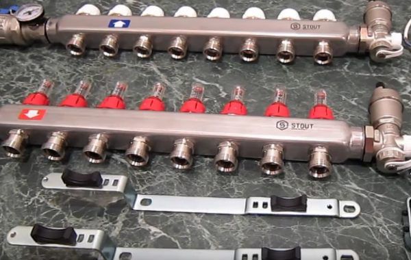 Les collecteurs de chauffage séparant les flux du caloporteur sont le plus souvent représentés par deux peignes de distribution. Le premier est la réception du liquide de refroidissement, et le second est son retour. La partie d'extrémité est équipée d'une connexion à la ligne d'alimentation ou de retour, et directement le long du corps, il y a des raccords pour charnières (circuits) du système de chauffage par le sol installé.