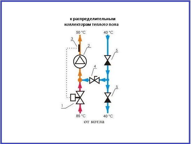 La principale différence entre le schéma «peigne» standard, équipé d'une vanne à deux voies, est représentée par l'approvisionnement continu en eau du «retour» sans l'utilisation de vannes de type d'arrêt spéciales. Dans ce cas, l'unité de mélange du système «planchers chauds» mélange périodiquement de l'eau bouillante dans des conditions de refroidissement du caloporteur inférieures aux paramètres spécifiés. Ce type de circuit a fait ses preuves dans la pratique, mais uniquement en l'absence de contours excessifs.