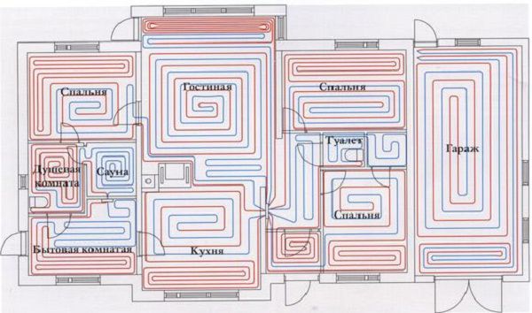 Le caloporteur du tuyau d'alimentation et le «retour» sont mélangés à l'intérieur de chaque sortie ou directement devant le collecteur, mais il est conseillé de confier le calcul du circuit optimal à des spécialistes.